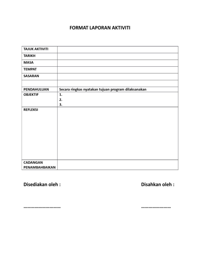 Contoh Format Laporan Aktiviti Persatuan. Download View Format Laporan Aktiviti as PDF for free. Contoh Laporan Aktiviti Kokurikulum Sekolah Setiap guru penasihat bagi persatuan kelab badan beruniform dan sukan di sekolah perlu membuat laporan untuk setiap.